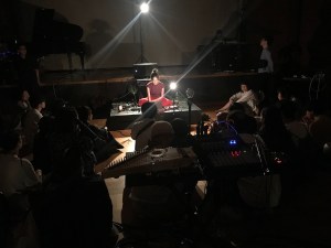 さて今年のAMFには、バンコク、ハノイ、ジョグジャカルタ、シンガポール、台北、コチからの音楽家に加え、日本からも気鋭のアーティスト陣がゲスト参加。会場のホールに入ると、そこは360度ステージで、中心にも楽器が置いてある。観客は、どこに居たらよいのか戸惑うも、次第に馴染んでいく。薄明りのなか、音の鳴る方、パフォーマーがいる方へ自由にゆっくりうねりとなって静かに移動する人々。床に這う無数の配線、無防備なスピーカーや楽器の配置に、観客たちがぶつかったり転んだりしたら……と思ってしまうも、それは杞憂に過ぎませんでした。それよりもこのユニークな状況を楽しむことだ。